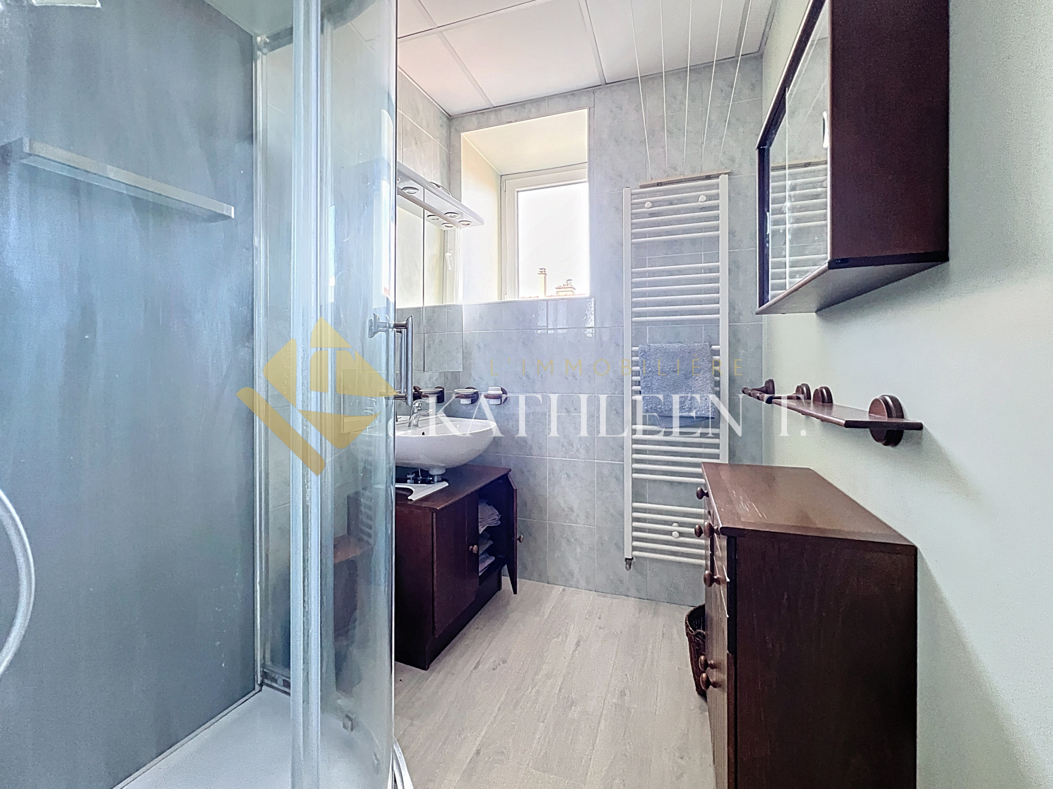 L’appartement se compose également d’une grande chambre de 16 m², d’un dressing avec placards, ainsi que d’une salle d’eau avec douche et WC indépendants.