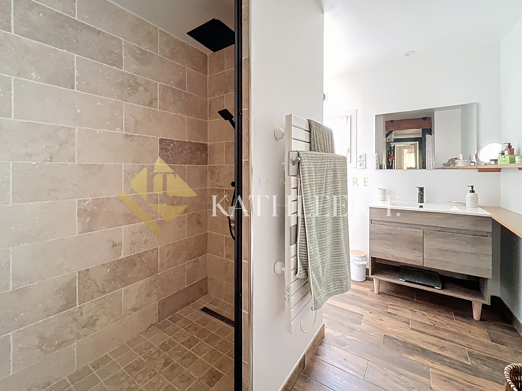 Le rez-de-chaussée accueille également une salle de bains, un WC ainsi qu’un espace buanderie fonctionnel.