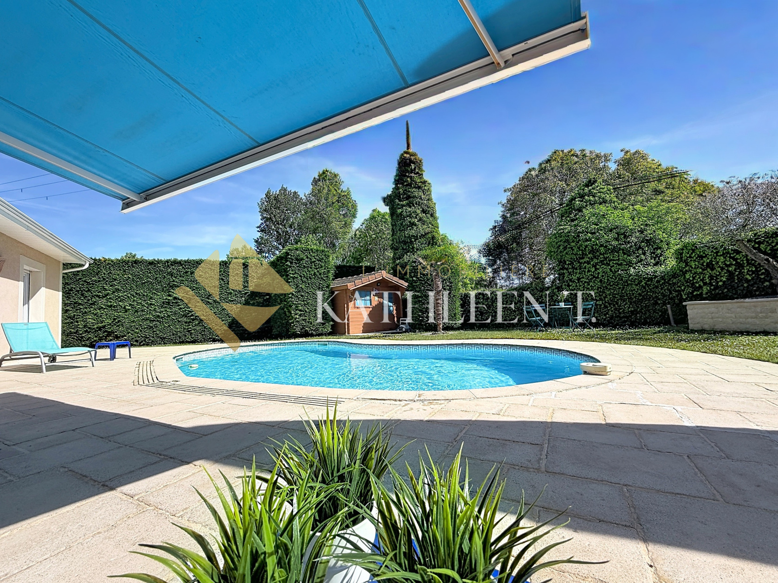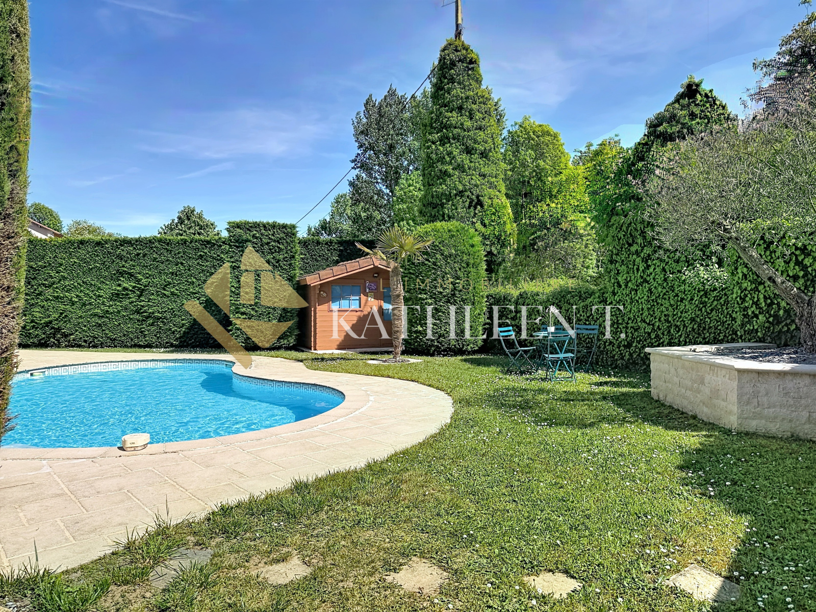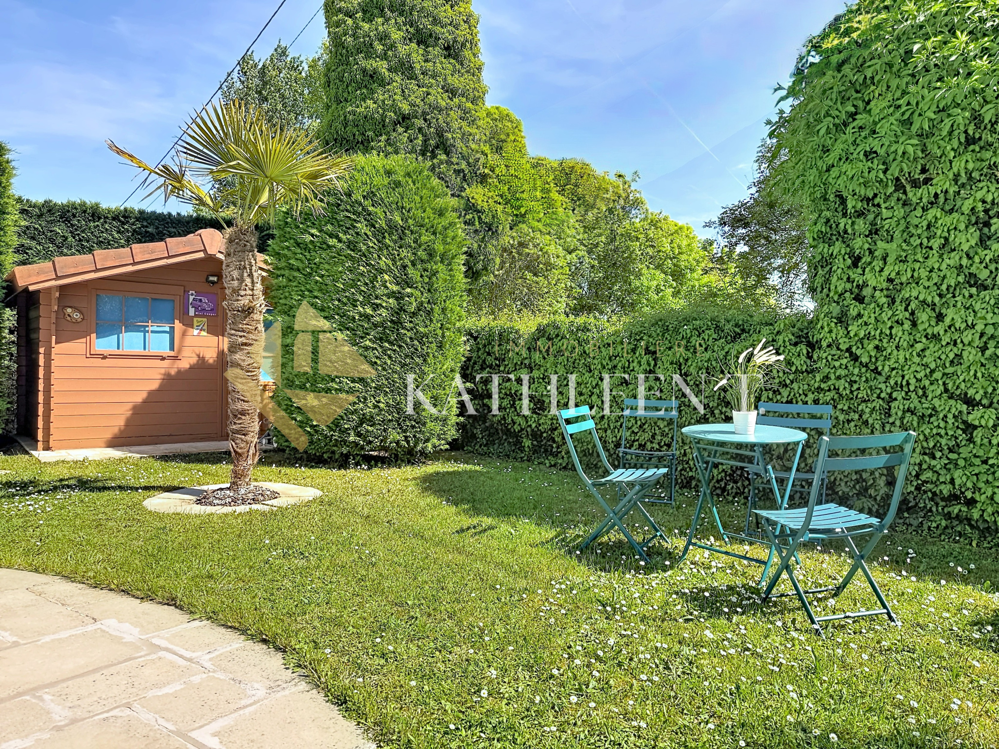 Le jardin, agréablement aménagé, offre un cadre verdoyant et facile à vivre. Il accueille une piscine, parfaite pour les journées estivales, et un abri de jardin pratique pour le rangement. La grande cour permet de stationner aisément plusieurs véhicules.
