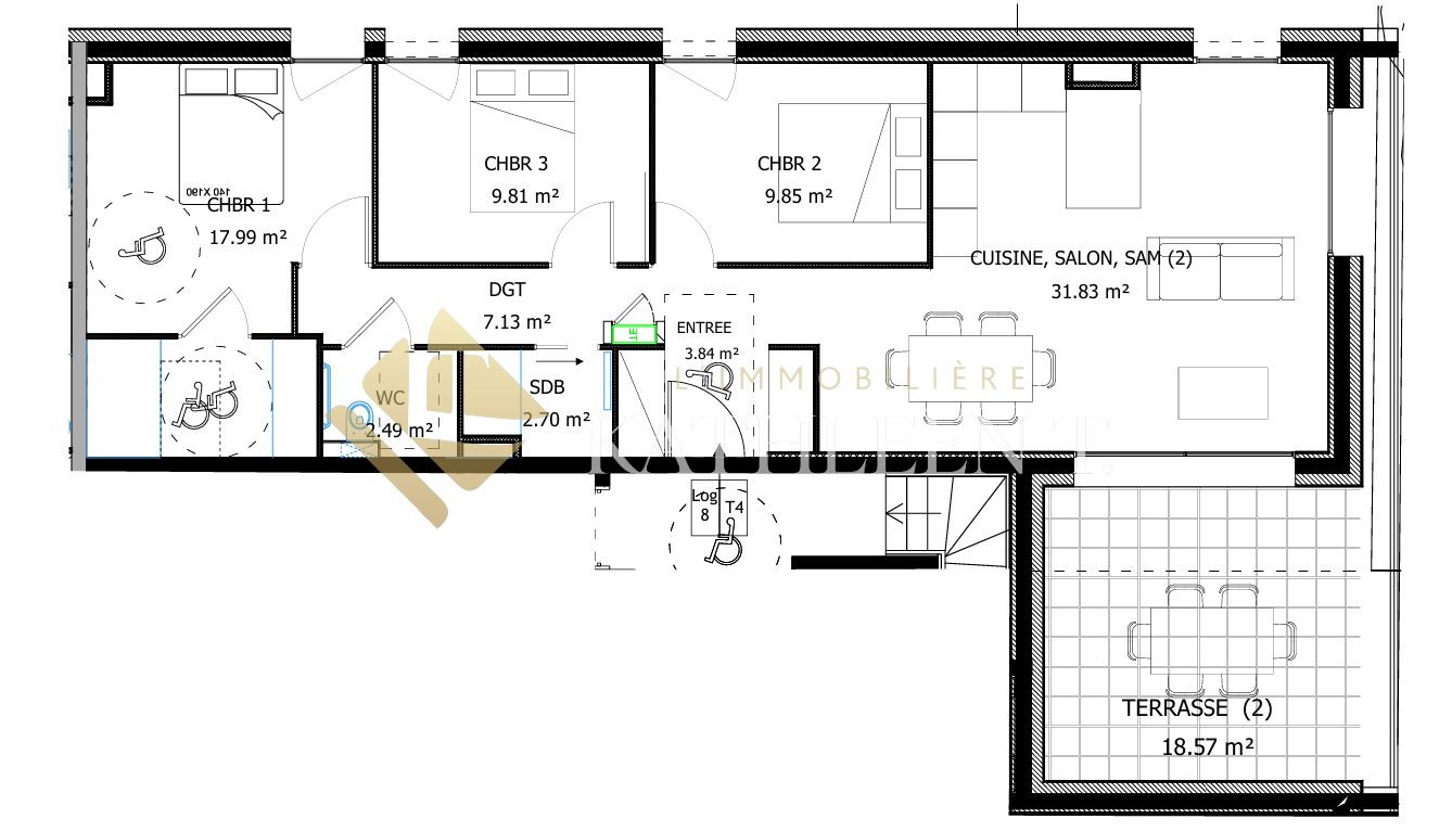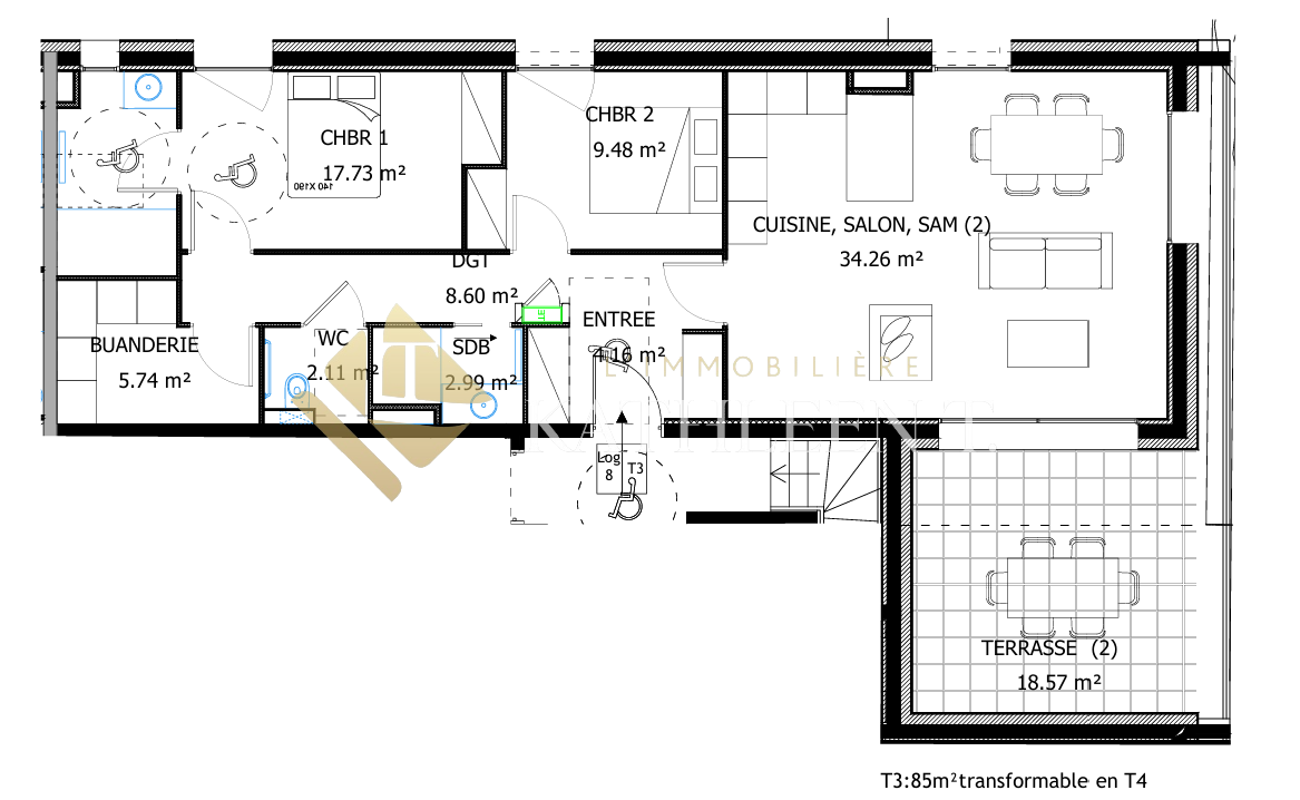 Appartement T3 modulable, offrant la possibilité d’un aménagement en T4 selon vos besoins.