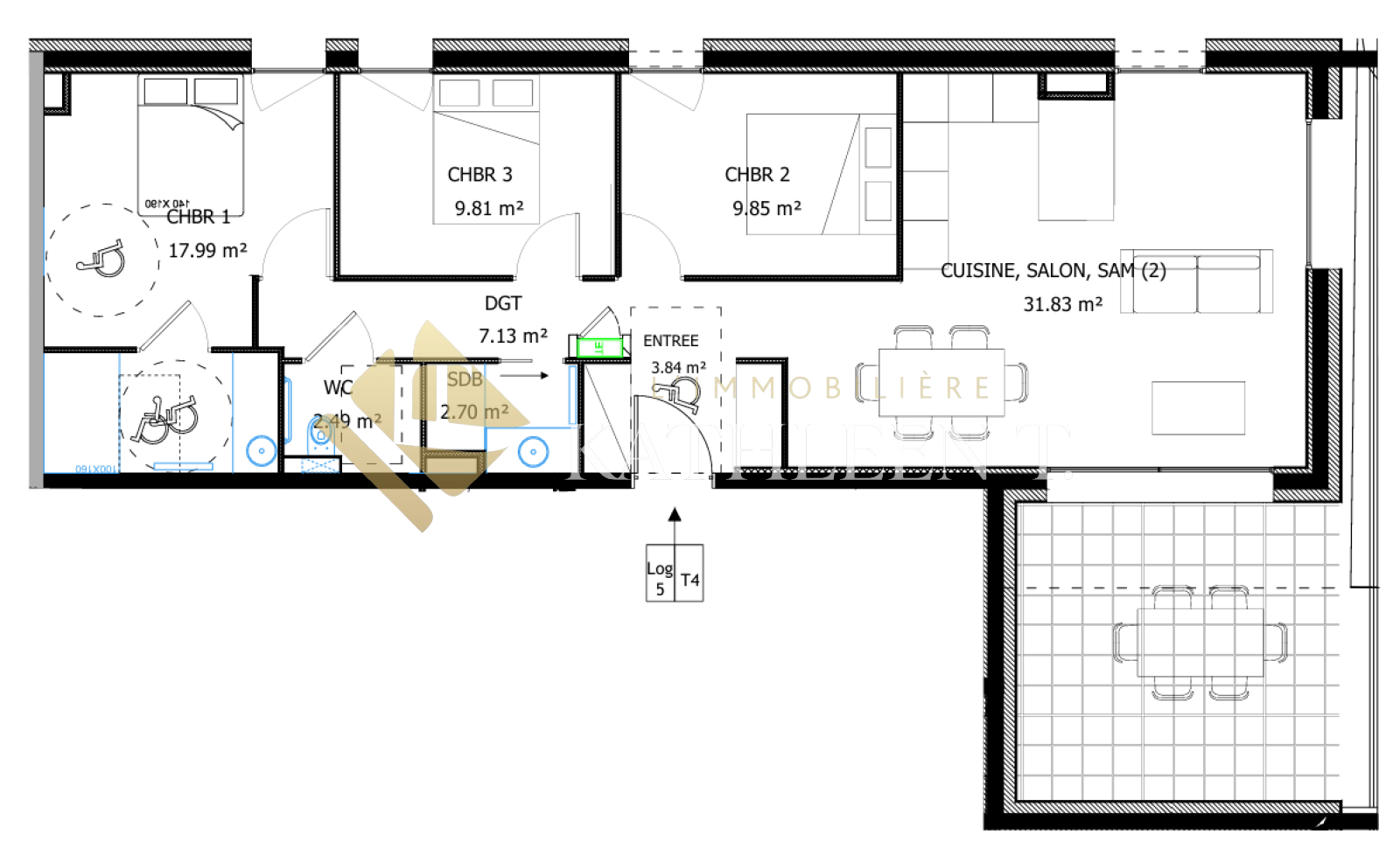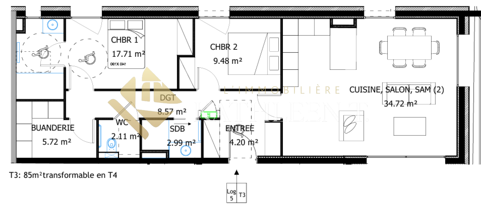 Appartement T3 modulable, offrant la possibilité d’un aménagement en T4 selon vos besoins.