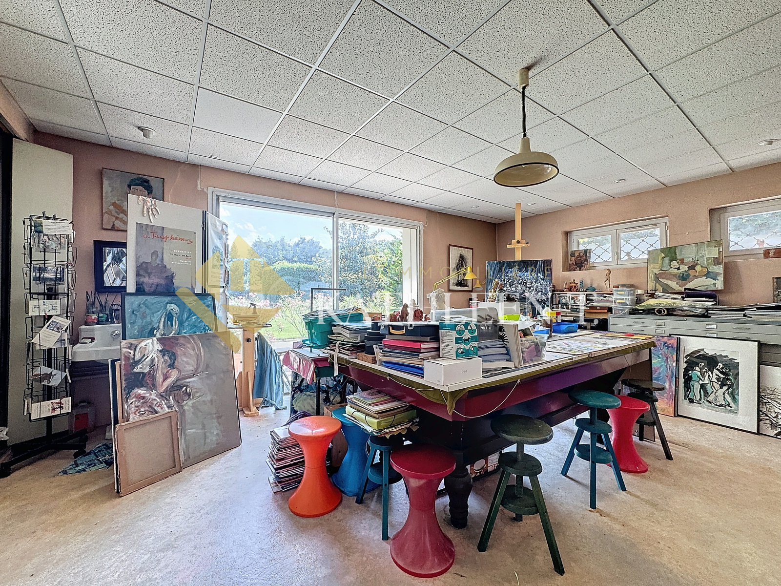 Vous serez accueilli par une spacieuse entrée, avec un atelier de peinture baigné de lumière avec sa grande baie vitrée, un bureau, une chaufferie, une réserve ainsi qu'une belle cave voutée. Dans l'autre aile, un espace dédié aux loisirs vous attend, comprenant une salle de jeux accompagnée d'une chambre et sa salle d'eau, offrant un espace privé pour les invités ou la famille.
