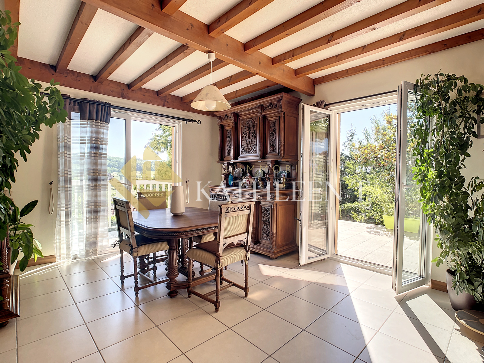 Ruy (38300)RUY, 5MN A43, 10MN GARE BOURGOIN-JALLIEU, belle maison de 202m² de surface utile (157m² habitables) sur 1469 m² de TERRAIN CLOS et ARBORE avec plusieurs espaces de vie, cuisine d'été, terrasses avec VUE DEGAGEE et EXPOSITION SUD, PISCINE, 2 grands GARAGES (25 et 18m²) qui offrent un cadre de vie agréable. En rez-de-chaussée : entrée, bureau de 21m² avec grands placards muraux, chambre d'ami de 24m², buanderie avec salle d'eau et WC, le tout offrant la possibilité de créer un appartement indépendant, chaufferie, accès aux 2 garages. En R+1 : belle pièce de vie semi-ouverte de 62m² env., comprenant salon avec plafond cathédrale et cheminée avec insert, salle à manger, cuisine équipée, cellier, baies vitrées offrant une belle luminosité avec accès aux terrasses, à la véranda et à la piscine, bureau, placard, salle d’eau, WC et 2 chambres (12,81 et 12,92m²). A l’étage R+2 : Un ESPACE PARENTAL : bureau (14,2m²), suite parentale avec terrasse et une belle salle de bains avec baignoire, douche, sèche serviette, WC, (24,45m²). Extrêmement lumineuse, dotée de beaux volumes, idéalement située, AVEC SUPERBE VUE ! . A DÉCOUVRIR ! REF 15635. DPE : D - Estimation des coûts annuels d'énergie entre 2056 et 2782€. Les informations sur les risques auxquels ce bien est exposé sont disponibles sur le site Géorisques : www.georisques.gouv.fr-Honoraires d'agence à la charge des vendeurs. Votre agent immobilier Béatrice Rostaing. L'Immobilière Kathleen T., 29 place du Champ de Mars, 38300 BOURGOIN-JALLIEU. Ouvert du lundi au samedi - TEL 04 37 03 48 12